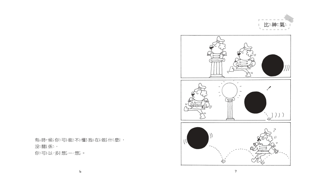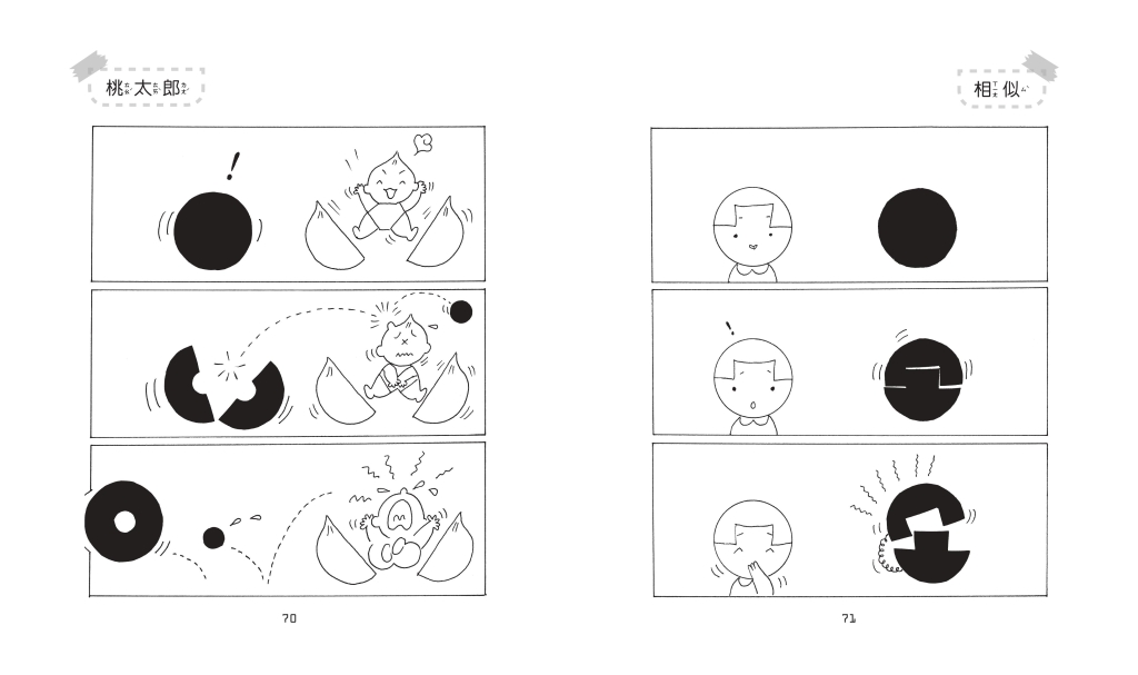 小黑也會分割成兩半,再重組成新的東西或新的形狀,不斷變化也不停發生許多有趣的故事。這時小黑開始了變四、變六或變八的不同面貌,同時也發生意想不到的想像力和幽默感,讓人會心一笑。欣賞過小黑的小故事後,家長可以鼓勵小朋友自己做圓形的黑紙,分割再組合的幾何造形遊戲,小朋友可以有趣的故事和遊戲中,激發想像力和創造力,也獲得學習和成長。