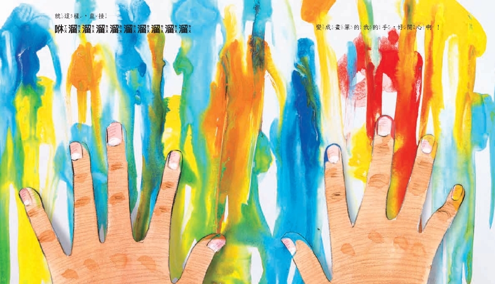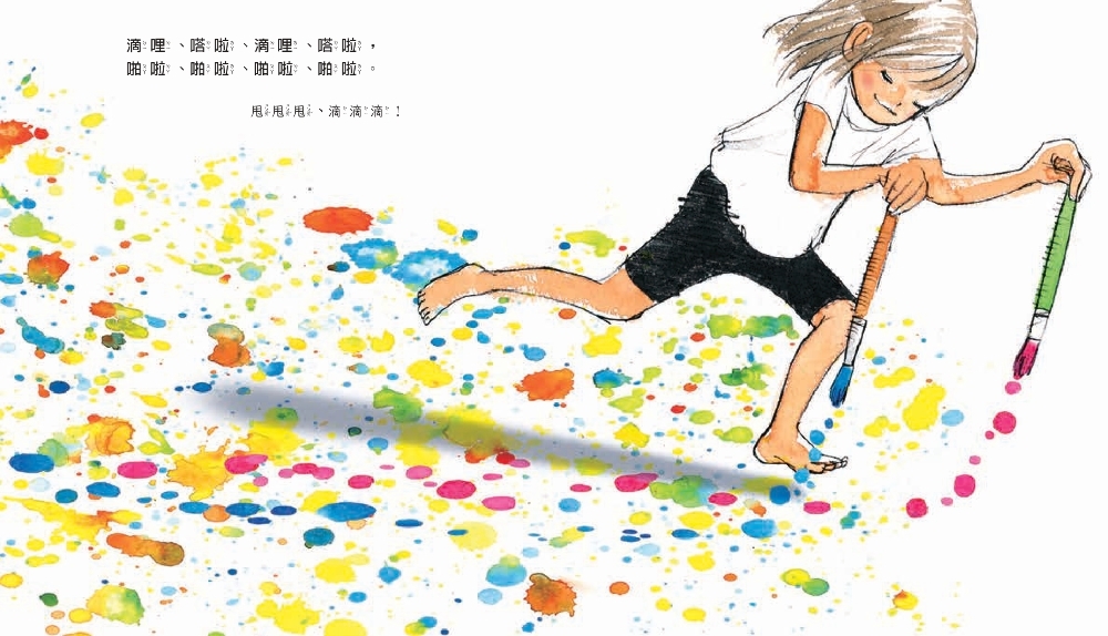 從畫筆、水桶,到雙手雙腳的共同參與和發聲,透過顏色的出生,為一大片的白底,帶來豐富的樣貌,跟著小女孩的一舉一動,感受無邊無際的靈感,傾聽每一個發出邀請的聲音,創造出自由奔放的作品,原來,畫畫是這麼輕鬆又有趣。