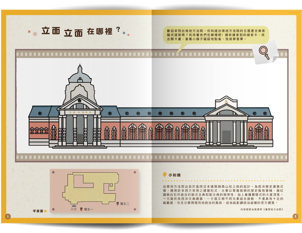 原臺南地方法院建造時代背景為日治時期,除了形塑威嚴外,更富有西式建築的華麗風格,別具特色。再者,建築中使用到許多雕花與幾何圖形,也不要忘了引導學習者仔細觀察。本次課程主題為「立面立面在哪裡?」,學習者年齡設定在國小中高年級,以建築物外觀為主軸,帶學習者從美學的角度了解本建築物。