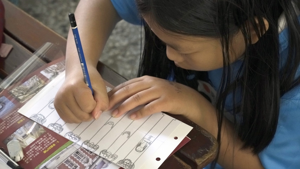 圖左/學習者仔細觀察假入口的外觀、裝飾圖樣,並加以記錄。(Source: 江篠萱)(圖/書籍內頁)