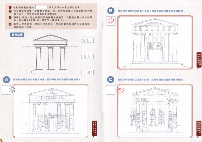 圖左/學習者需在限定的時間內仔細觀察三個立面,找出不同的特色。由於課程設計結合了藝術領域,所以也要求學習者從每個立面找出至少兩處特別紋路並畫下來。(Source:葉秀玲)(圖/書籍內頁)