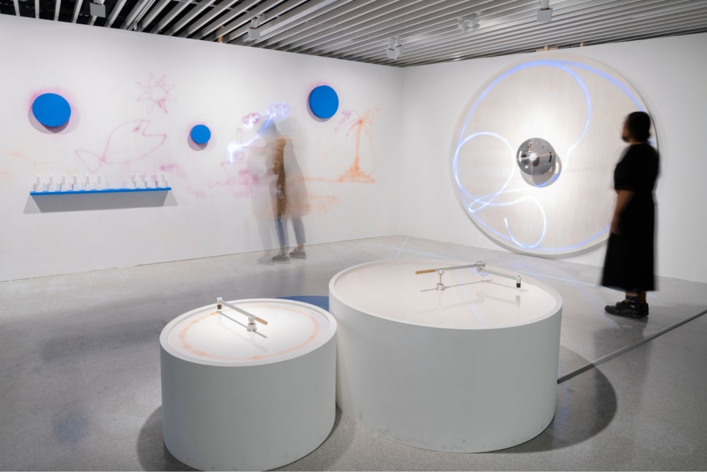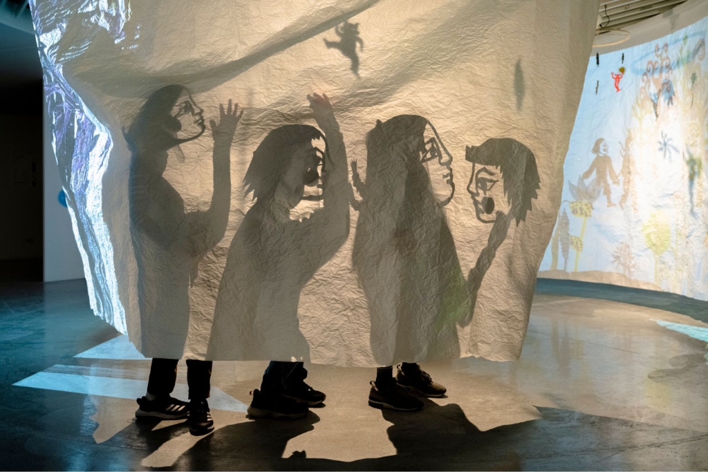 蔡宜婷《非線性科學:混沌》運用馬達、紫外光和變色漆,以感光原理捕捉光的擺動軌跡,更首次為展覽打造大型的「光畫布」空間,邀請親子觀眾手持紫外光燈源,一起勾勒光的運動。飛人集社劇團以彩繪紙幕、懸吊紙偶等,為兒美館現地搭建一座「光影戲」裝置,邀請親子觀眾加入人偶共演劇場,運用現場的「偶」和「光影」體驗操偶敘事。