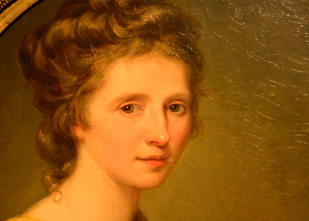 往前走兩步,一位端莊優雅的女子用她清亮透徹的目光與你相會。從她那隻拿著筆夾、放在畫本上的右手,你一定也會注意到,這位女性藝術家正在用自畫像彰顯藝術家身份。在她生活的18世紀,男性主導著整個藝術世界,女性要成為一位職業藝術家是非常困難的事情。優秀的瑞士新古典主義畫家安潔莉卡・考夫曼,是1768年倫敦皇家藝術學院僅有的兩位女性創始成員之一,你可以想像她是多努力、多傑出,才能成就如此前衛。那筆直自信看著我們的眼神,正在跟你說:我的繪畫專業才華與淑女的美貌品德彼此相得益彰,完全無違和啊!