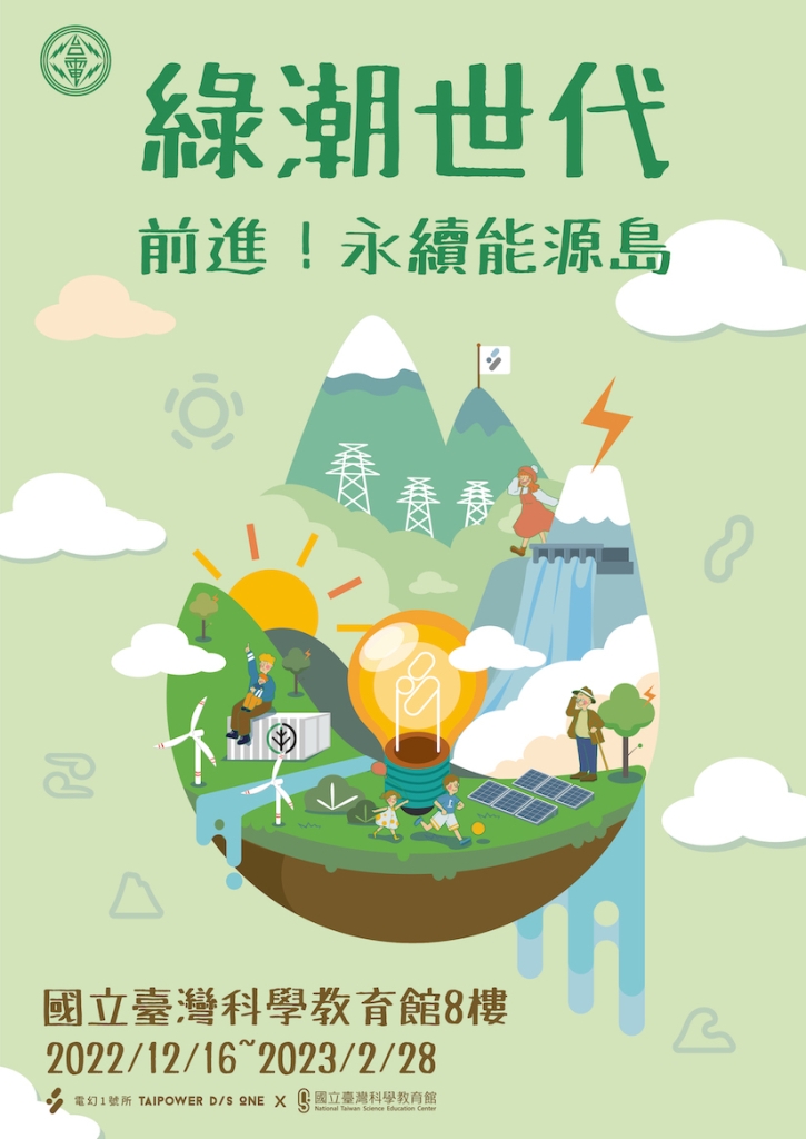 台電綠能展館-電幻1號所首次攜手國立臺灣科學教育館舉辦《綠潮世代:前進!永續能源島》微型展覽,以大小朋友都能融入的互動展覽模式,傳遞給G世代主人翁們席捲全球的綠電知識以及台電深具前瞻性的減碳行動,期待G世代能夠開始喜歡綠能、關注綠能、了解綠能,一起建立理想中的永續能源島。