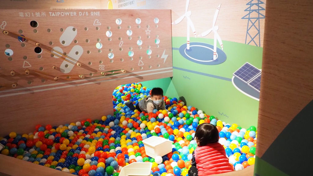 第二主題區則透過互動多媒體及電流互動球池,讓小朋友在玩樂之餘,還可化身電力調度員,挑戰維持電力供需平衡。「電流互動雙向球池」將電網概念具象化,試著將球投入用電牆上的洞中,看看電會到哪裡去呢?