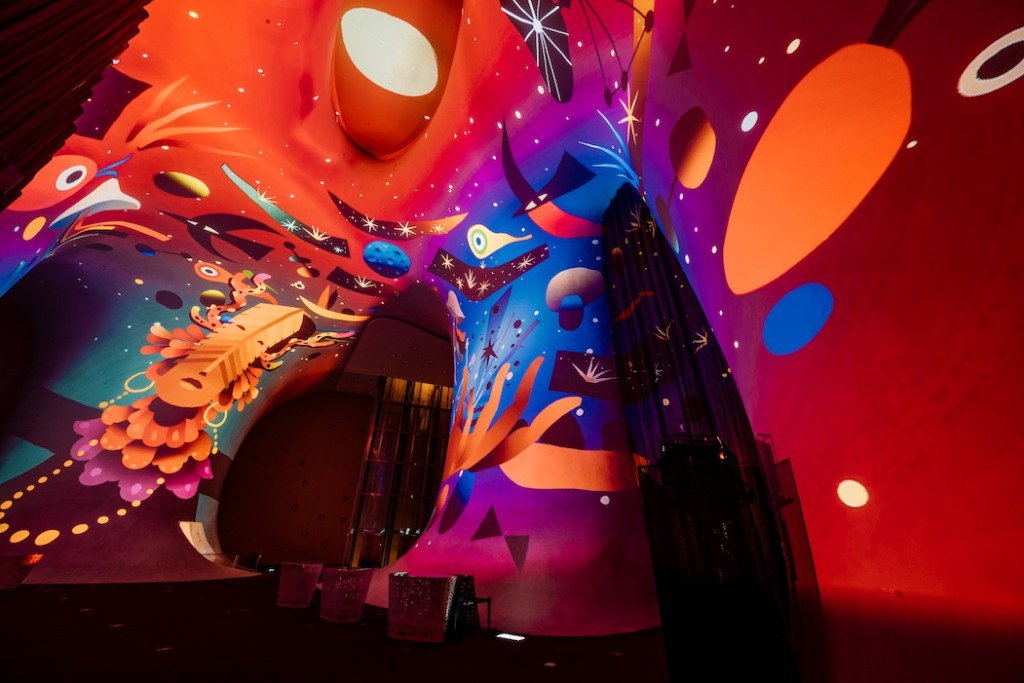 緊接以歡樂氣氛陪伴觀眾度過農曆春節的《未來生物圈.Rimiyoho的幻夢世界》,由墨西哥視覺藝術家Fernando Sica與奧地利投影表演藝術團隊OMAi,以繪畫投影軟體Tagtool共創。繽紛手繪感的塗鴉、超現實謎樣小生物、生態池包圍,強烈視覺律動充斥感官搭配迷幻樂曲,彷彿一座散發光與和平的星球。