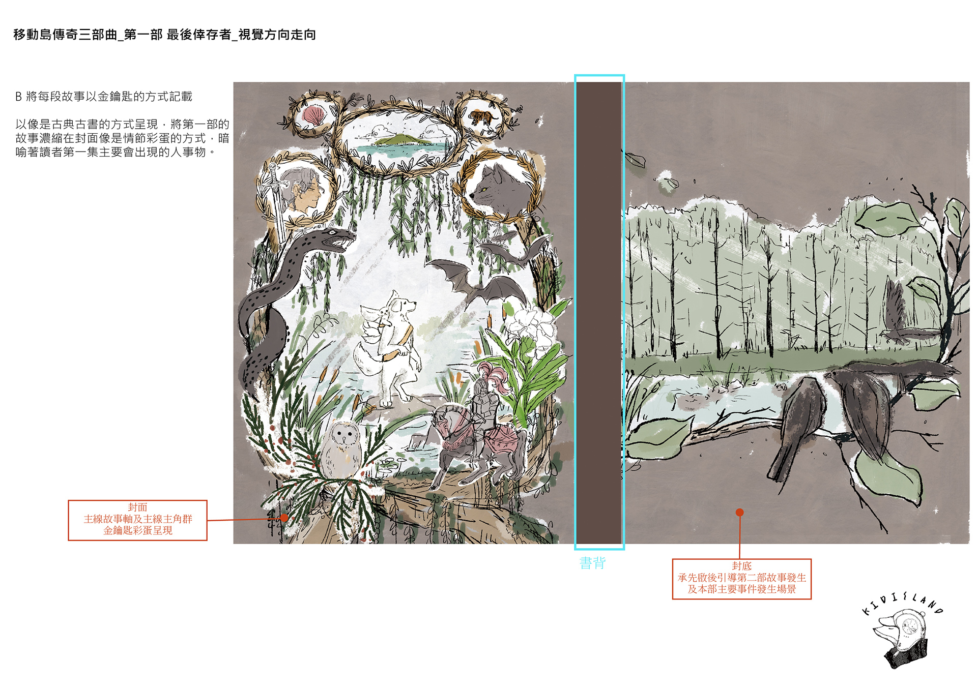 正式進稿後,整合了讀後資料思考著書封主視覺時,把自己想像成是位中世紀史學的紀錄者,並以兩大方向作為出發。一種以像是歐洲教堂裡記錄著聖經的古老壁畫一般,電影定格畫面情境式的記載故事,一種則像是精緻古典書的方式將每段故事以金鑰匙的方式記載在書封上 。