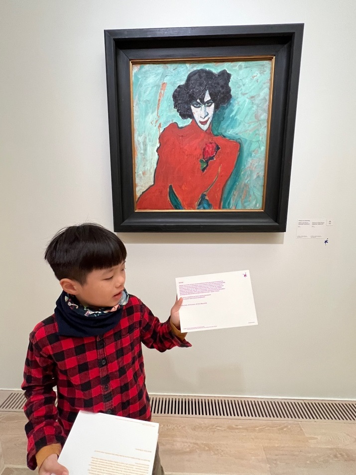 當阿皮這麼解釋完,我也突然覺得這一幅畫非常像是在畫一個「男性說教(mansplaining)」的場景。而當時的我們,還沒有深入知道孟特在畫康定斯基的那時候,她對他的崇拜和愛慕,以及希望有婚姻之類穩定關係的期待,已經消失且到了關係末期。孩子對畫作環境氛圍直覺,的確令人嘖嘖稱奇,而當有議題圖卡的協助,畫作者或是策展人想要敘說的概念,仿佛也能迅速傳達給孩子和陪伴的我。離開美術館之後,孩子的畫作呈現了許多記憶重點,像是「渣男(孩子視角)」的藍色衣裝及眼鏡。