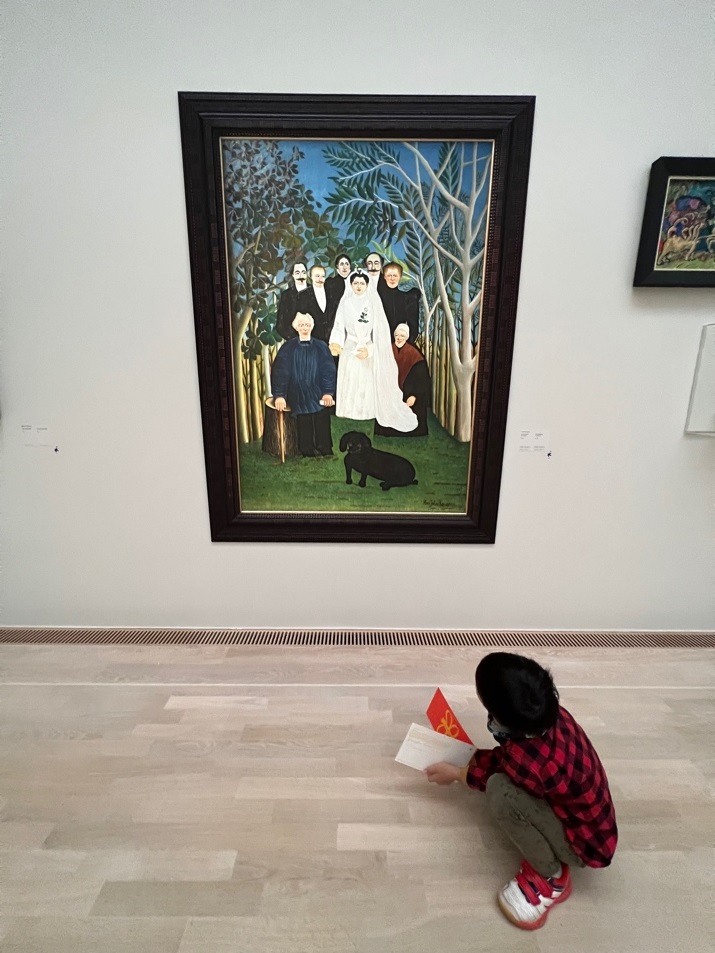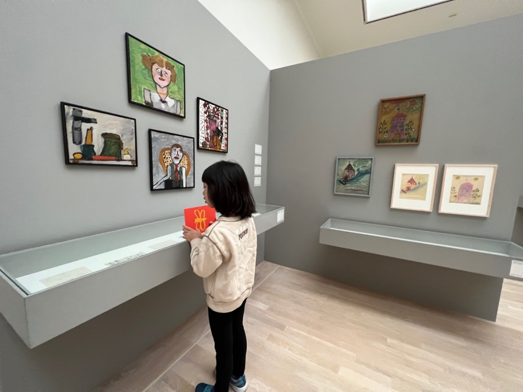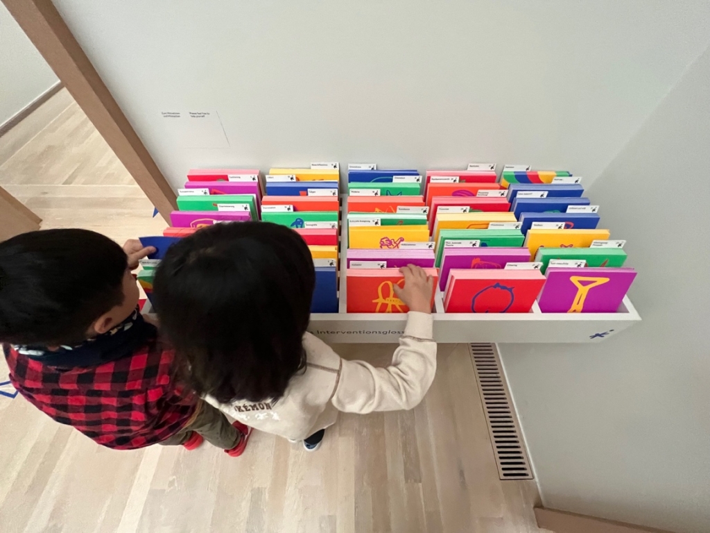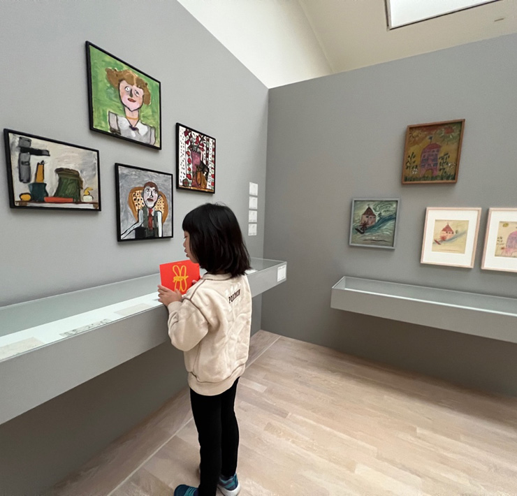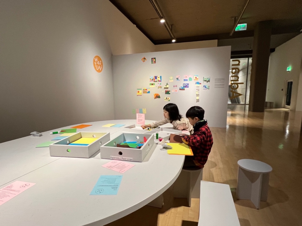 小孩在美術館購票時,就感受到自己是被歡迎的,即便幾乎所有展館是開放六歲以下孩童免費,八歲的阿皮竟然也被給予免費入館的優待。售票的工作人員是一位年事已高的女性,她問了孩子年紀、我也誠實以告孩子歲數,同時也講了自己歲數的冷笑話,她笑了我一下後,邊印製票券邊說:「孩子免費,但希望他們有參與感,所以也印兒童票,請拿給他們。」