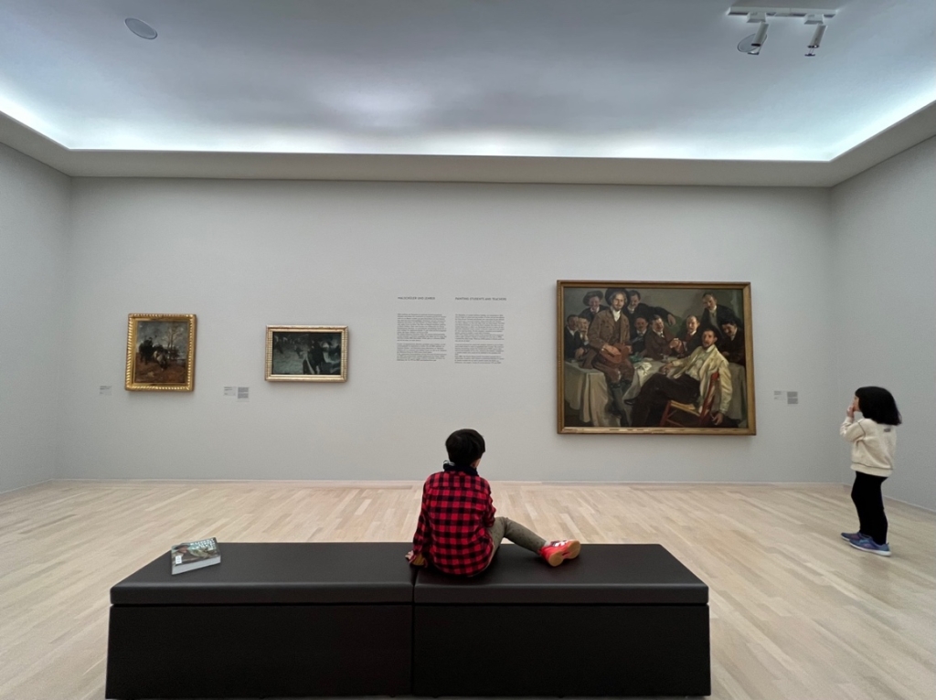 逛到腿軟了,坐在展品前邊休息也能邊繼續欣賞畫作,對小孩也是一件重要的友善。「美術館很大,所以走累了可以在它幫我們準備的椅子上休息,但是我自己是沒有想要休息,所以繼續觀賞我想觀賞的每一幅畫作,」阿皮補充。