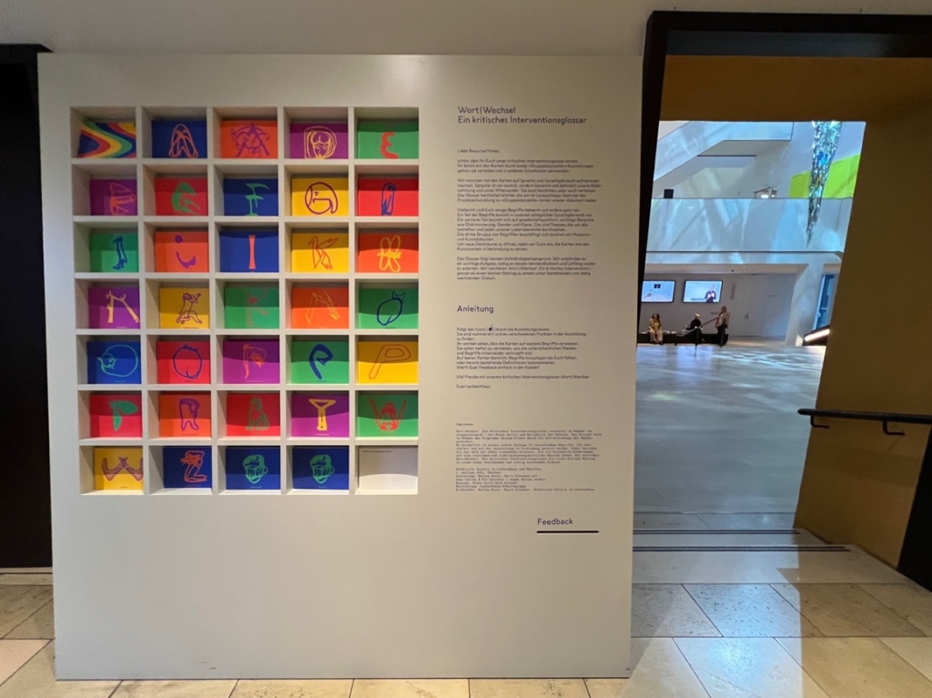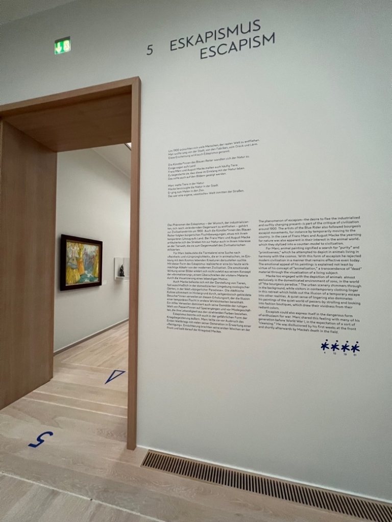 在《藍騎士藝術家們的團體動力:現代主義時間的集體性(GROUP DYNAMICS The Blue Rider: Collectives of the Modernist Period)》特展,孩子自己突然發現特展準備了五顏六色各種議題的圖卡,內容包括:階級、東方主義、現代性、集體性、後殖民理論、性別、有毒的雄性氣概等。讓喜歡尋寶解謎的小孩對這個特展開啟了探索的興趣,讓觀展不只是靜態的或是被導覽的被動性,而是開啟了孩子能自主路線和理解方式的主動性。