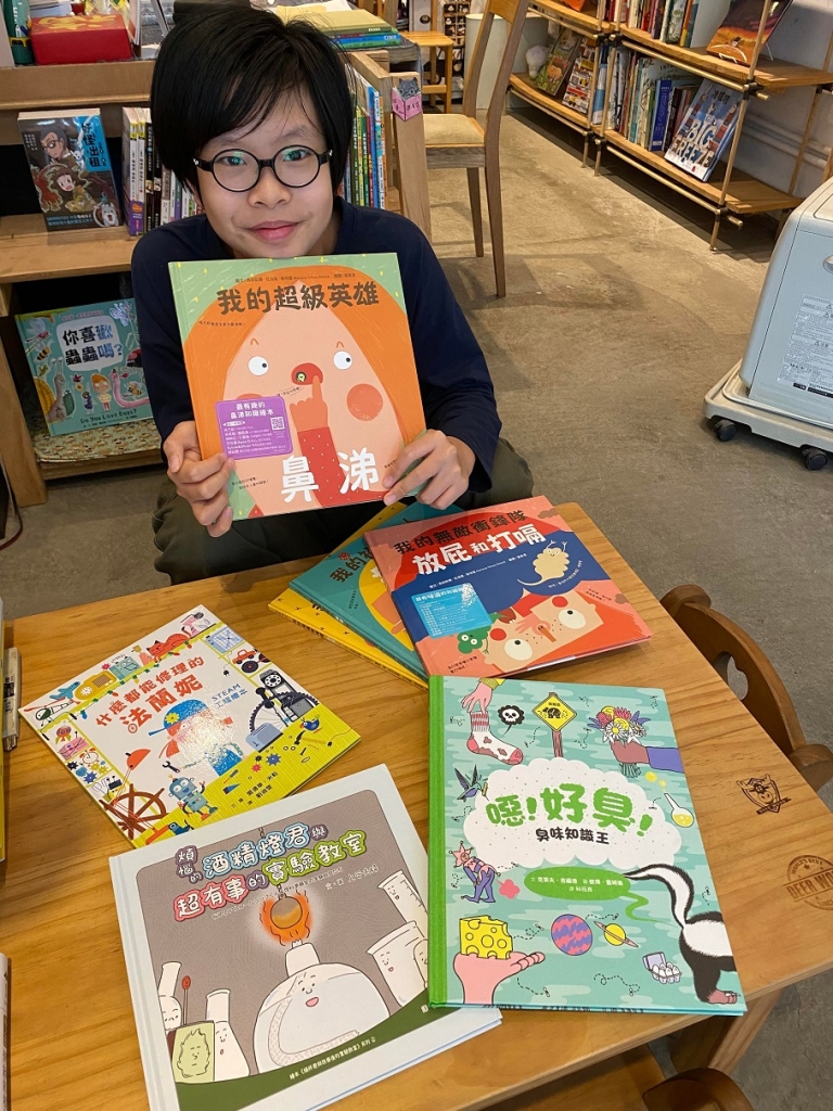 在我家的書店裡有一個很特別的書櫃,很多人第一次逛到這個書櫃,都會先露出疑惑的表情,看到書櫃上寫:「闆寶的選書」才會恍然大悟,因為這個書區和其他書架的選書很不一樣,我常會選很多媽媽比較不會接觸的繪本和圖文書,特別是和自然科學有關的主題,而且要能逗我笑和激發我好奇的書,媽媽常說我的選書也開啟了她閱讀新的方向,沒想到自然科學主題有這麼多有趣的書,這次我就來分享幾本我特別喜歡的科學繪本和圖文書吧!
