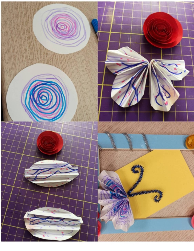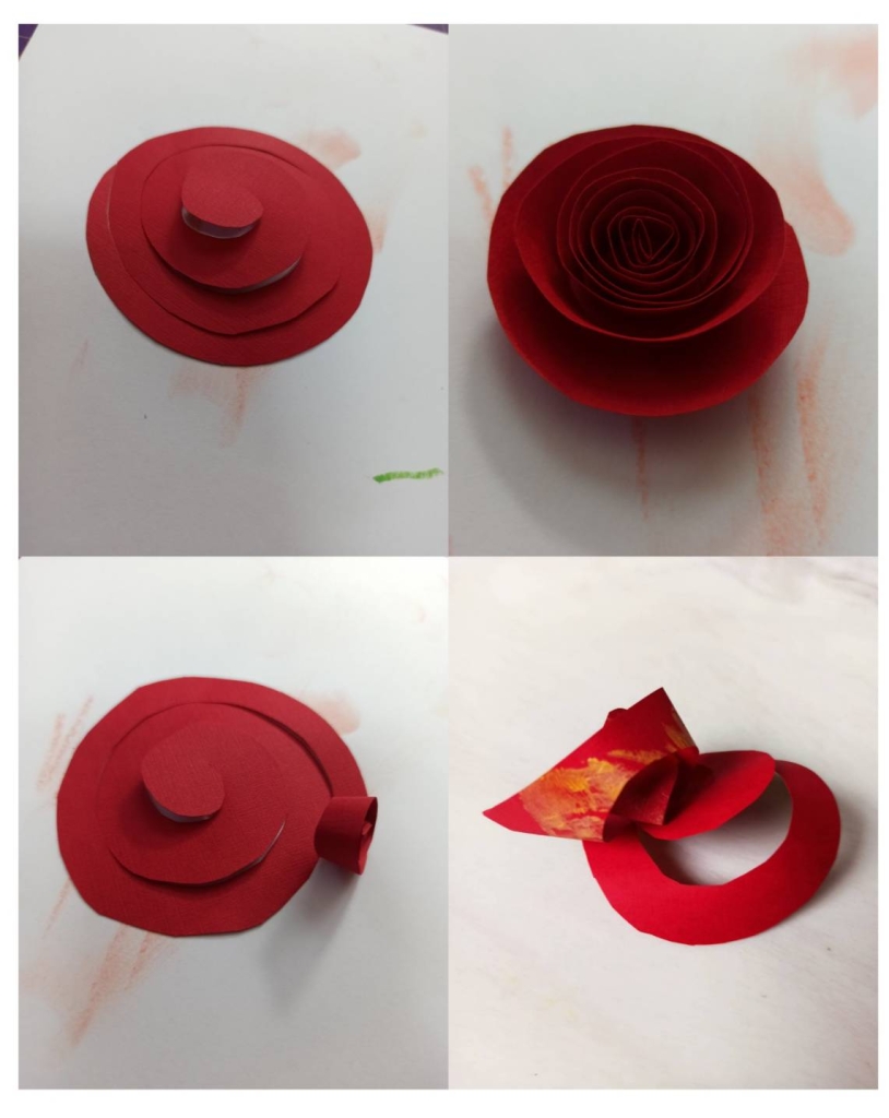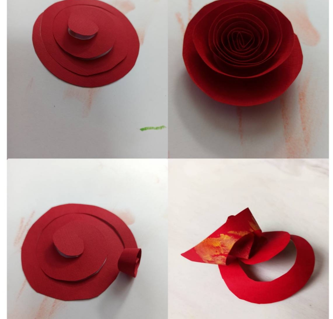 另一個圓形可以仿蚊香造型,剪出鍋牛殼的形狀,再從外向內捲起來,最後會形成一朵美麗的花朵,教學過程中,一個三歲的小女孩無意中一個穿插,意外成了一個漂亮的胸針(圖4)。