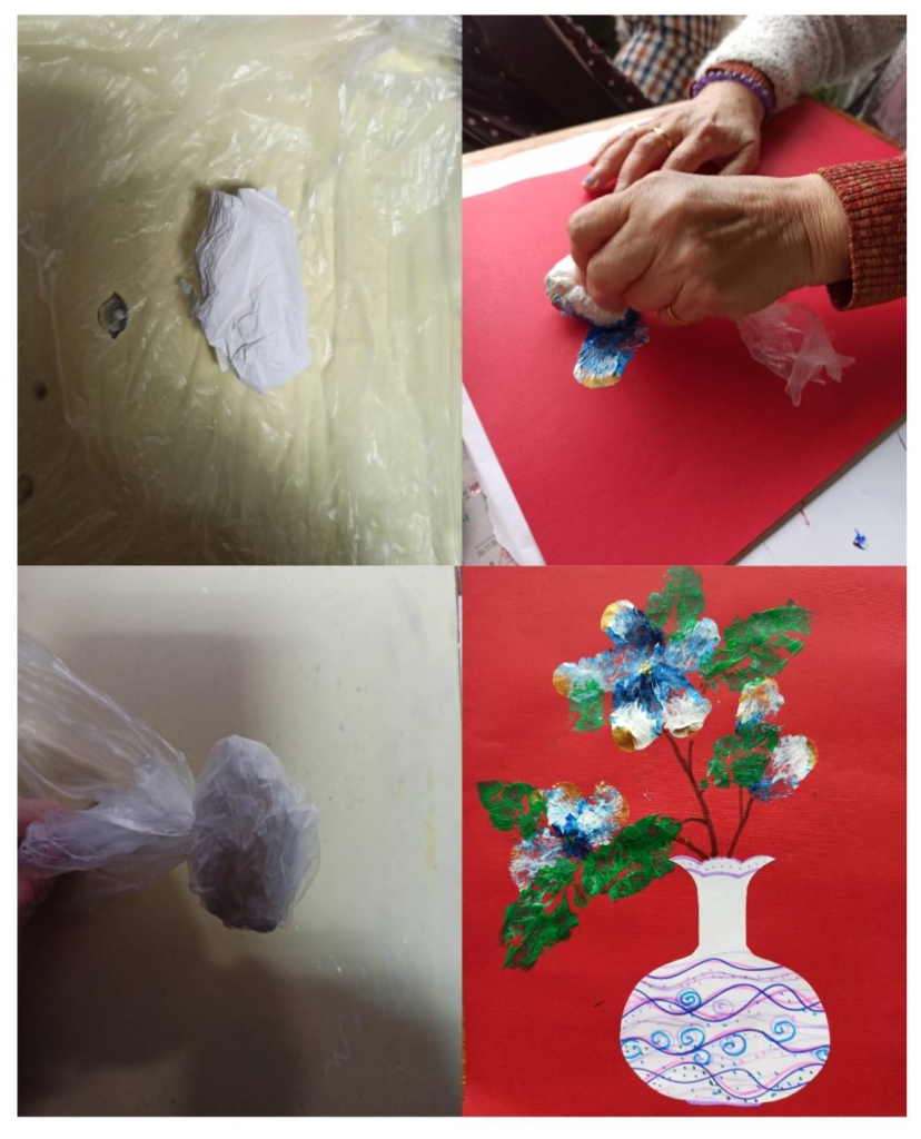 利用回收的塑膠袋將一張捏揉過的衛生紙包好,再利用橡皮筋綁緊;再來調出花瓣需要的顏色,此次活動用的是壓克力顏料,拿起綁好的塑膠袋沾取顏色,再將花瓣的末稍沾上一點其他顏色,為了讓花朵有層次感,可以利用2到3種顏色,然後印蓋在我們要的紙張上,加上設計感的花瓶,成了一件美麗的作品(圖5)。
