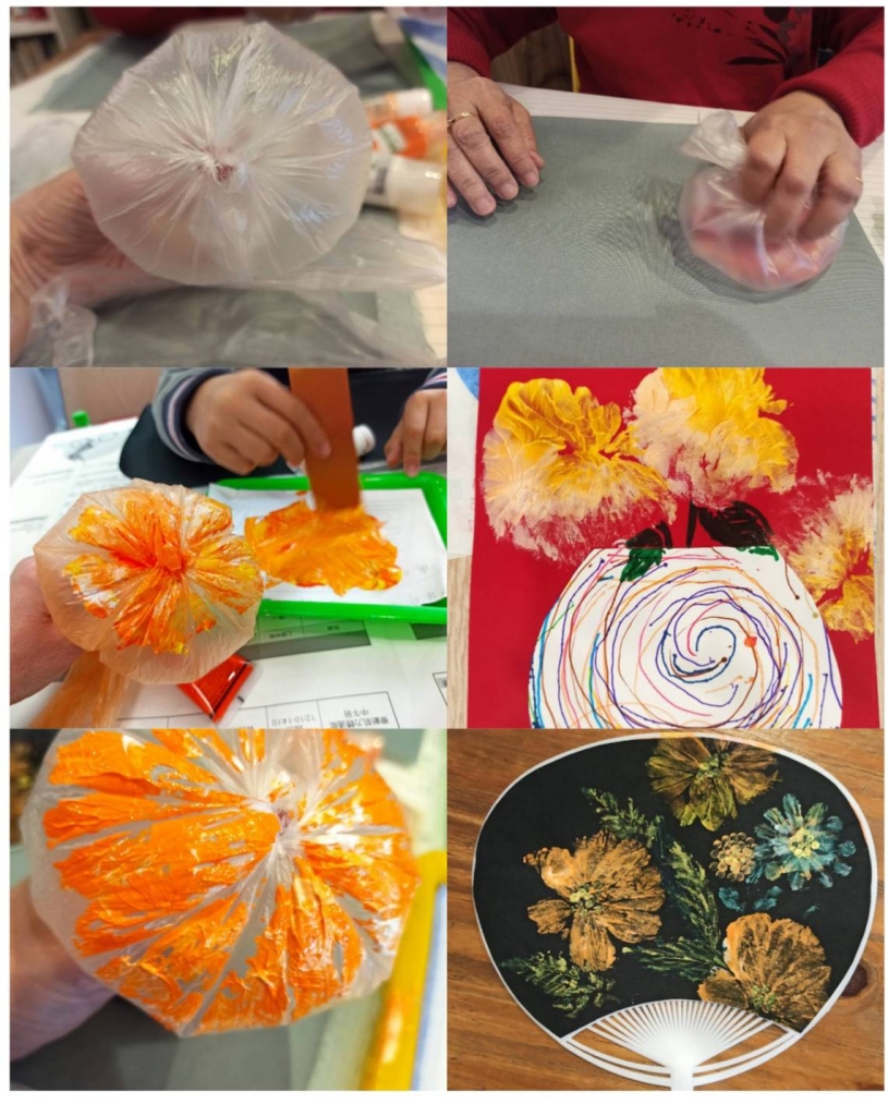 將一個回收的塑膠袋底部綁一個小結,整個翻面,吹入空氣後用另一條橡皮筋綁緊,沾上壓克力顏料後,就可以印蓋成一朵花朵。以上兩個活動,若想要綠葉襯托紅花,可以摘取現成的植物葉片,並使用葉子的背面葉脈較為明顯,使其充份沾上顏料後再蓋出,一件有特色的作品就完成囉(圖6)!