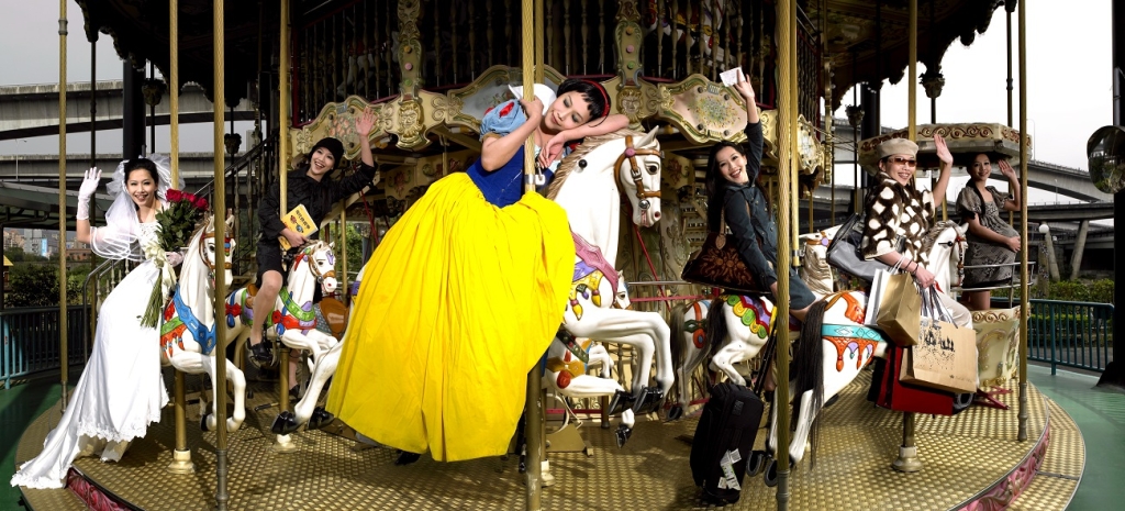 何孟娟《白雪公主》系列扮裝影像,如同刻意營造的劇幕場景,藝術家透過自扮角色和擬像,邀請觀眾與她化身為童話般的理想主角,身處故事其中,觀察周邊看似「配角」又似「分身」的人物,透過角色彼此的矛盾張力,試圖表現女性在社會期待、自我審視等價值觀中,各種樣貌、焦慮及他人賦予的刻板印象。