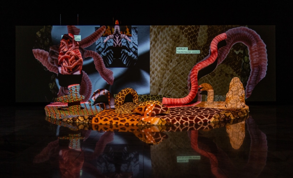 劉玗《假使敘述是一場洪水》試圖解構許多民族起源的傳說「大洪水」,藝術家結合影像、口白吟唱、雕塑建構神話場景,漫延敘事中的集體記憶與意識流動,並投射各式圖騰於泥偶雕塑之間,試探講述人類共同起源的敘事結構與變動狀態,提供思考當代世界觀的想像路徑。