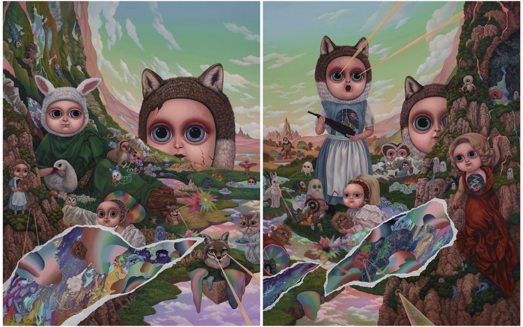 展場亦延續首波計畫「雲朵不見了」,張嘉穎以童話、夢境為畫本,卡漫式超寫實風格呈現包含本館典藏品《貓貓谷的躲藏》等3幅繪畫。畫中的每位角色都有雙大眼睛,當與他們目光相會或視線游移時,看似獨立個體的人物則會因為觀者各自的想像而譜出不同的情節,觀眾亦可於現場掃描QRcode進行「眼睛放大術」,與畫中的人物互動或合影;裝置作品《謎.幻.鏡》,將萬花筒機械裝置放於無限折射的鏡房之中,邀請大家走進幻境般的繽紛視覺,如同沉浸在無止境的敘事發展裡。
