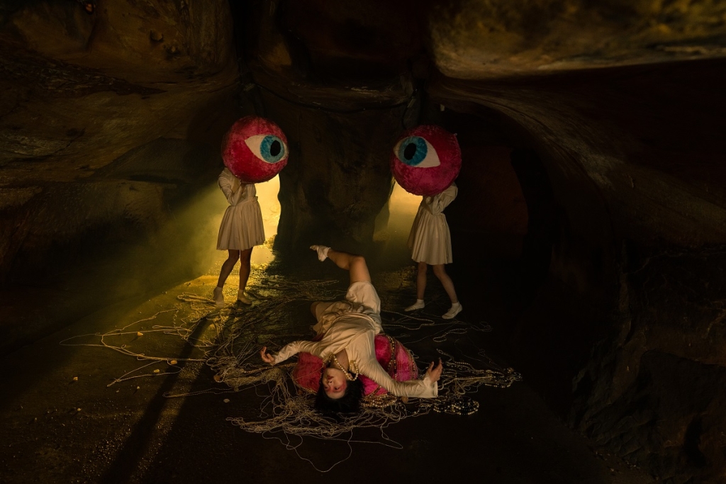 此外,張碩尹以神話「巴蛇」為主題的互動式劇場《她吞噬大象,之後成為了一座山丘》,另新增有關該神話再詮釋之錄像作品《碧浪公主》── 以洞穴作為神話、母體的最初隱喻,透過傳統民謠引領海島民族的共同記憶與歷史。劇場空間設有感應式裝置,捕捉在場者的位置,觸發後將變換舞台的聲景及光線投射,觀眾意識到自己的選擇與行動可以改變作品敘事的發展,故事結局由其自行決定。