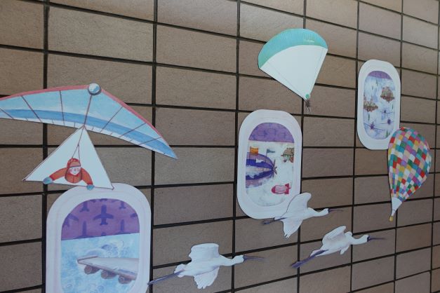 二樓展區是以人為飛行為主,最早飛行是從達文西觀察鳥類開始,雖然創作許多飛行器但都無法飛起來。展場外大型插畫牆,先用飛行歷史的角度,闡述以前的人到底為什麼會發想飛行?飛機是怎麼樣創造出來的?運用簡單提問的方式帶出飛行史初步概念與想法,認識關鍵性的歷史人物,讓小朋友從中找到飛行與生活的連結。 畫面尾端也畫出想像中的「未來飛行器」,更是從旗津的角度俯瞰,希望帶給孩子從過去到現在的「飛行」樣貌,也希望去思考未來的可能性與想像。