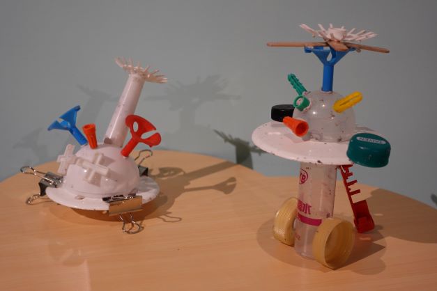 藝術家莊惠琳《今晚我想來點…》用平衡鳥的概念呈現。仔細看,鳥的肚子裡還有好多塑料,藝術家分享,某次去海邊就看到鳥類誤食人類垃圾的衝擊,作品除了以鳥的平衡畫面呈現,也希望小朋友想想,人類跟環境要如何去取得平衡。這裡有一些讓小朋友可以現場創作的平衡鳥。