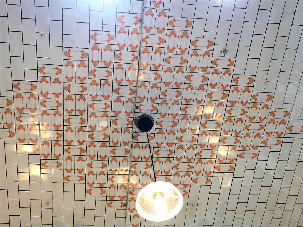 共感覺在整修過程中,也意外發現隱藏在天花板輕鋼架後、令人驚喜的老屋花磚。雖因塵封多年而呈現冷灰,但仔細擦拭後,顯出底下原本的光澤:對稱的橘色四芒星與黃色圓形,好似破蛹展翅的彩蝶,就像被掩埋的舊日時光,因著書寫或閱讀等活動,再度被賦予鮮活的意義。