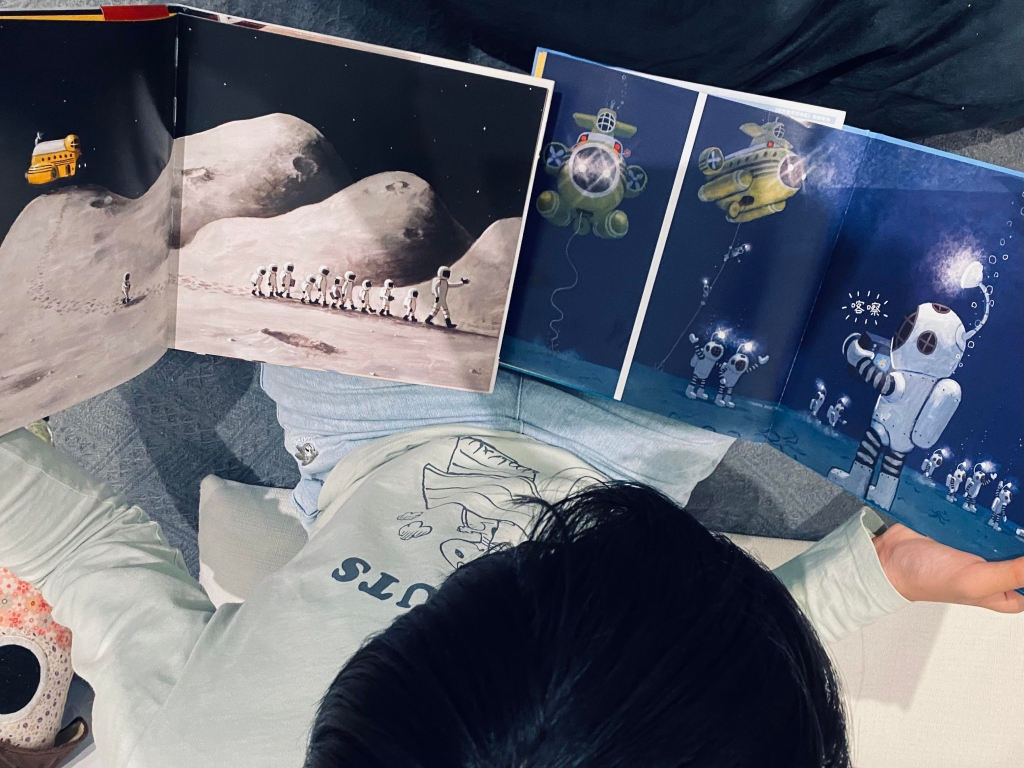 第二站,還在外太空就來一趟《校外教學到月球》吧,這是一本無字書,但圖像非常精彩,因為沒有文字,你可以用自己的想像力閱讀,就像書裡那個帶著蠟筆和畫紙去參加到月球校外教學的小男孩,他總是在隊伍的最後面,看自己的風景,畫自己的圖,後來雖然因此被遺忘在月球上,卻遇見了其他同學都沒法發現的驚喜,沒有固定必須遵守的規則和方向,這樣的校外教學真的好棒呀!如果意猶未盡,可以再展開《校外教學到海底》,這個故事除了有同樣因為和同學失散而發展的意外旅程,還讓我們藉由這個意外看見海底珍貴美麗的生態風景喔!