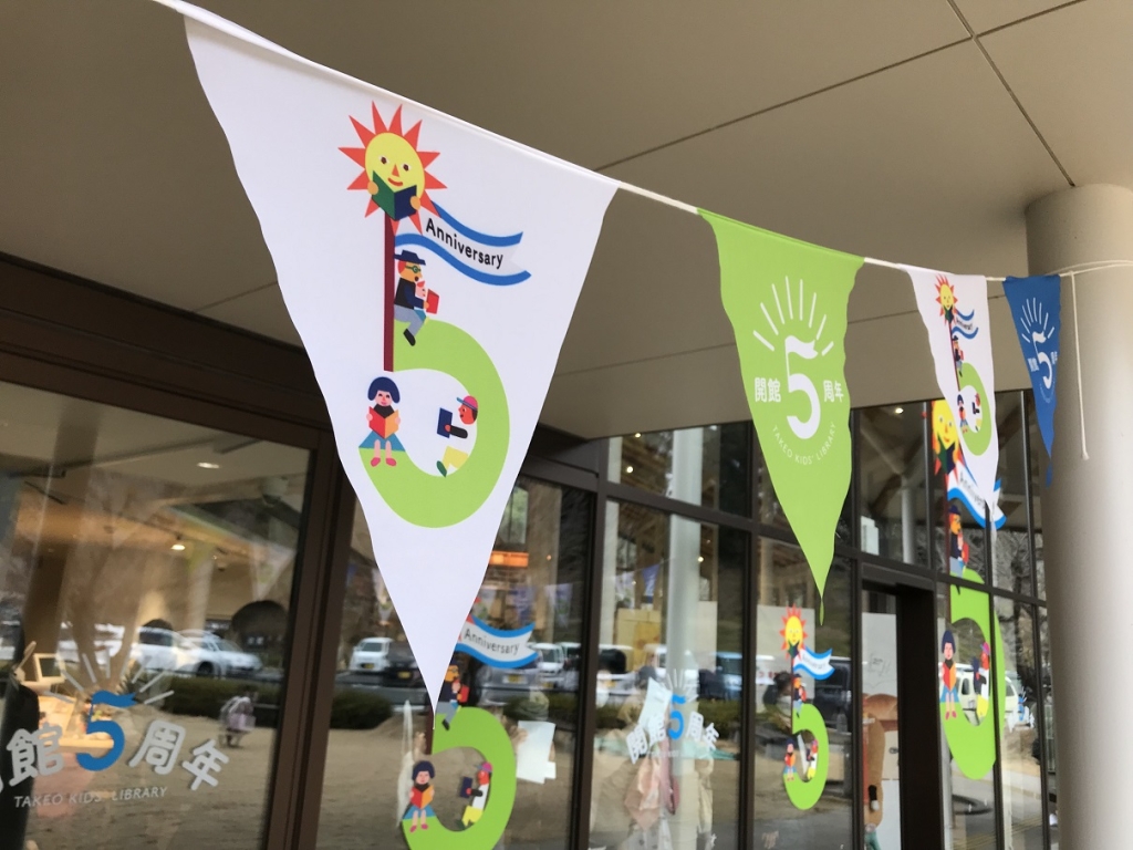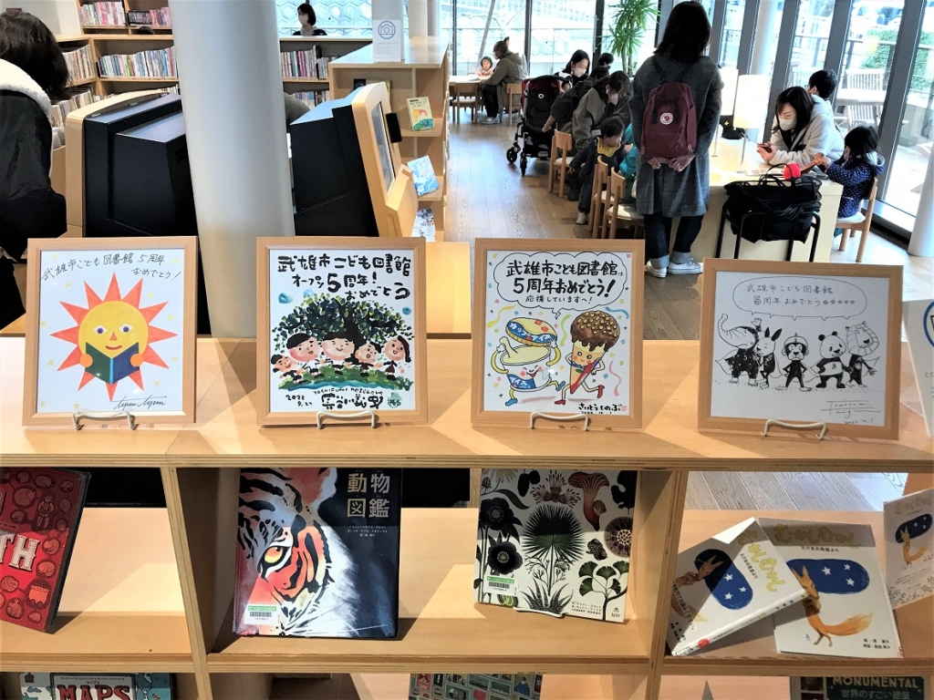 除了簽書活動之外,正逢開館五週年慶,所以館外不僅有TUPERA TUPERA設計的五週年慶圖樣,在書櫃上也放著各童書作家簽名祝賀的紙板。