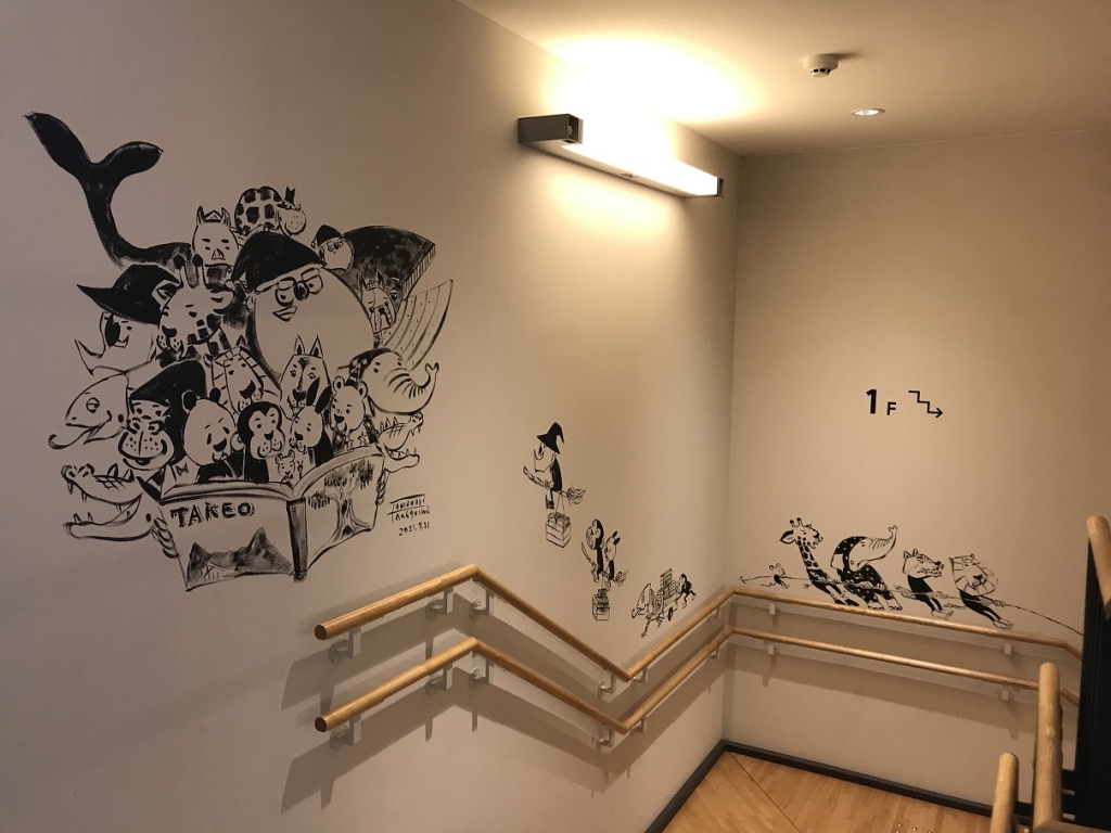 通往二樓的樓梯區有一幅由TUPERA TUPERA創作的大樹圖案,牆壁上也有許多繪本作家的繪製的圖案,四處洋溢著童趣。面對階梯山的右手邊有一個祕密空間,往裡一鑽,原來是漫畫、文字書(橋樑書和小說)以及嬰幼兒繪本的專屬空間。從這個空間繞出去還有一個樓梯,通往另一個小夾層平台,同樣牆壁上也畫滿圖案,空間設計讓人有一種探險與祕密基地的興奮心情。