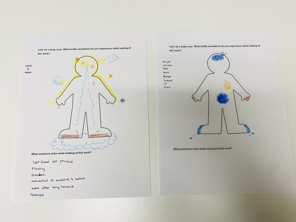 我常在看藝術作品時邀請參與者進行這個練習,因此會連結回作品的討論,詢問可能是作品的什麼部分引發這些身體感受。當然,情緒和身體感受都是很個人的事情,所以我會先提醒大家:如果有哪裡不舒服不自在的地方,不需要解釋可以不用參與,分享也依大家意願不強求。