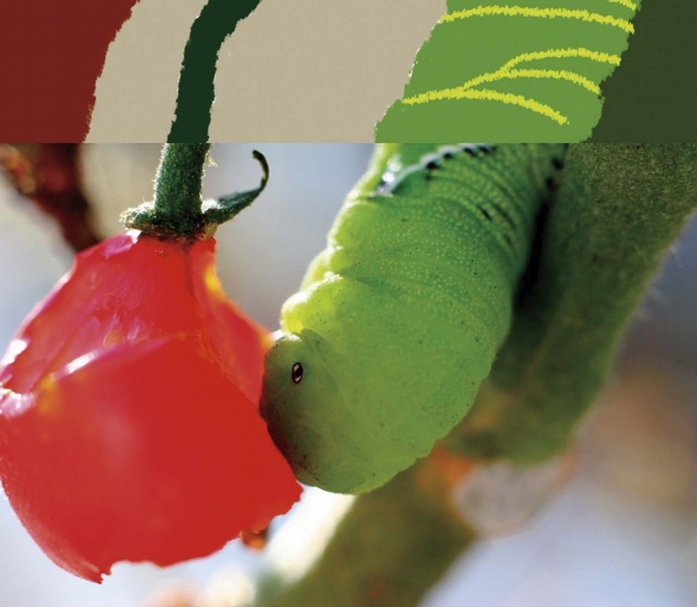 「菸草天蛾」的幼蟲,正在享受好吃的番茄大餐。 ©ProjectJenova