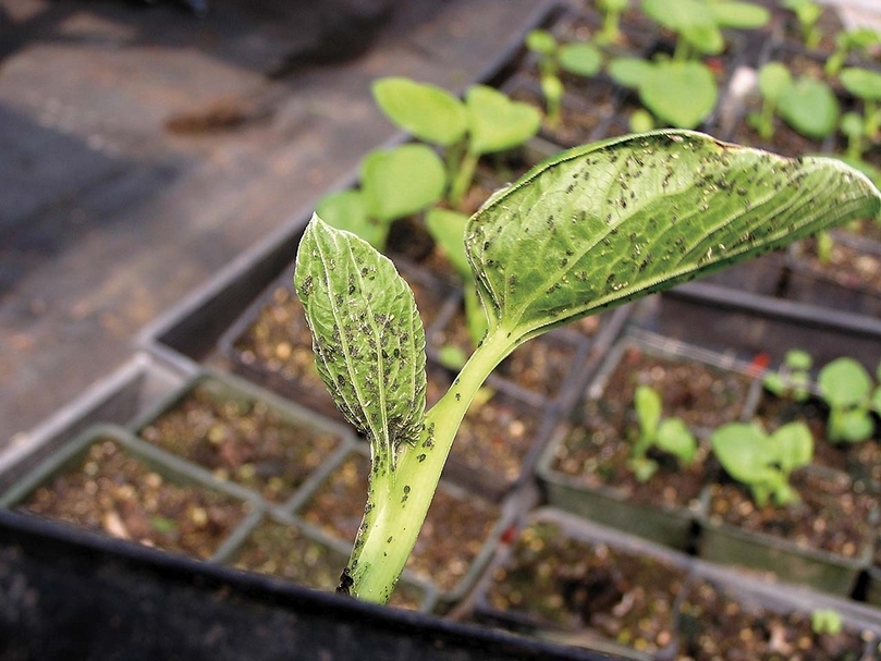 SOS!小黃瓜的葉子背面,爬滿了蚜蟲的幼蟲。牠們會讓小黃瓜生病。 ©Scot Nelson