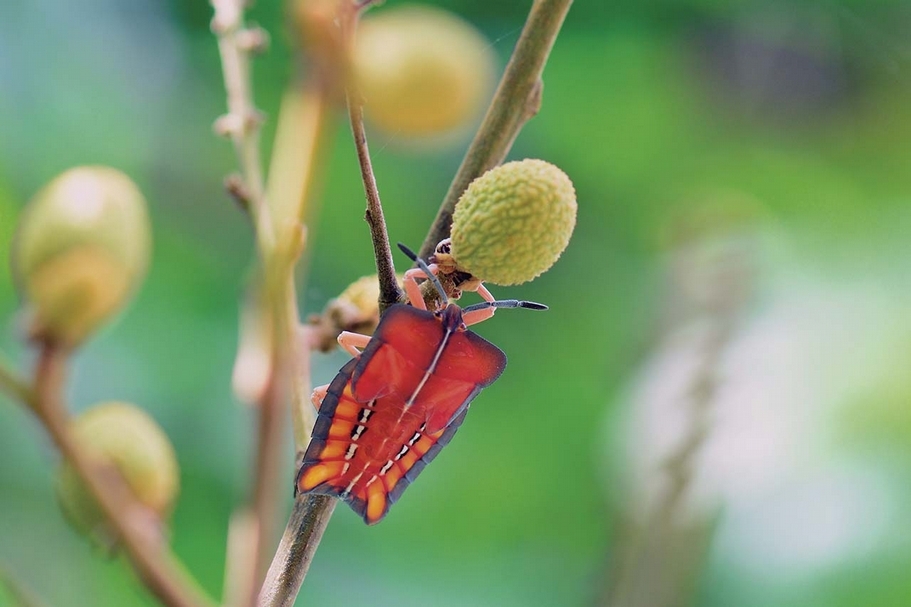椿象很喜歡荔枝和龍眼樹,牠會自備「吸管」,插進樹幹、樹枝和果實裡吸果汁來喝。 ©Ares Hsu