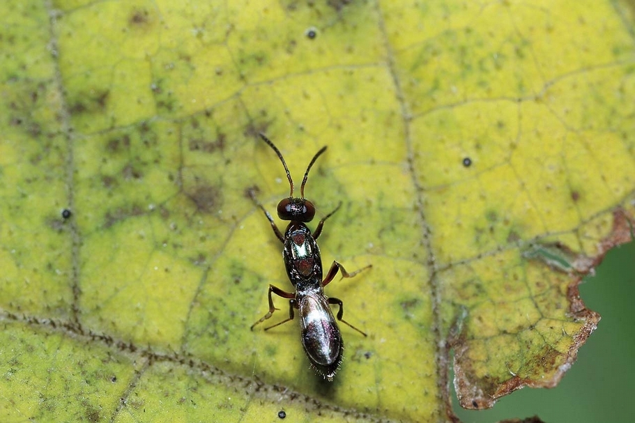 平腹小蜂對椿象很有辦法。牠會把自己的蛋生在椿象的蛋裡,然後幼蜂會把椿象的幼蟲當食物慢慢吃掉。 ©tosakah