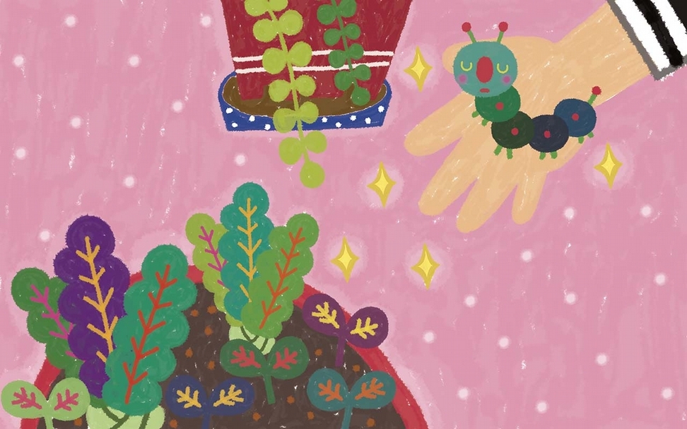 「阿公說,蟲沒關係,蟲跟人一樣愛吃菜,蟲吃的少,人吃的多,蟲吃剩的再給人吃。」多多揚起手,讓阿宏可以湊近看青蟲,全身綠色、胖胖的青蟲其實滿可愛的。