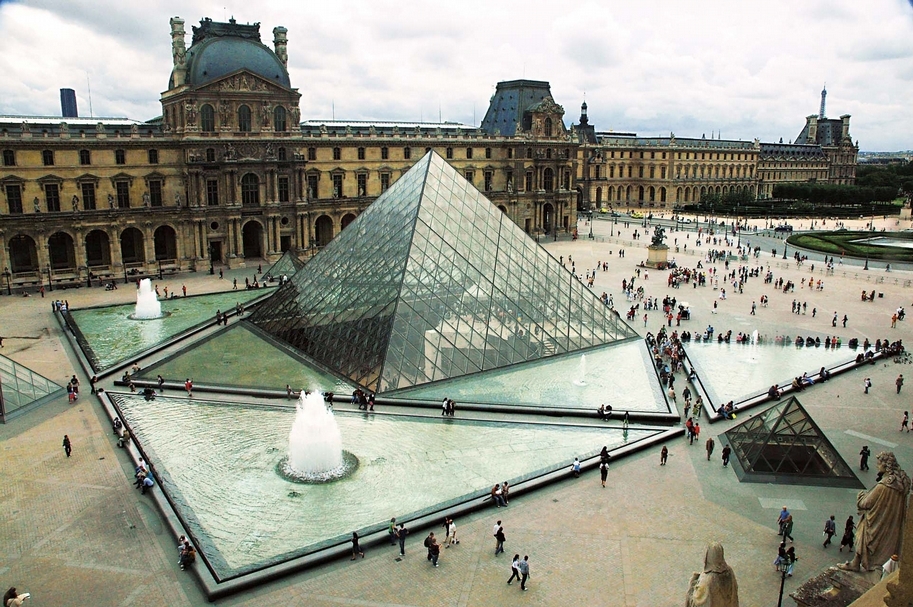 在巴黎羅浮宮前的廣場,有四座玻璃金字塔和七個噴水池,都是由▲構成。最大的金字塔是羅浮宮博物館的主要入口,建築師貝聿銘﹙1917-﹚覺得,金字塔是最節省空間,也是最具有變化的造形,他希望陽光可以直接透過玻璃,灑落在位於地下室的畫廊。
