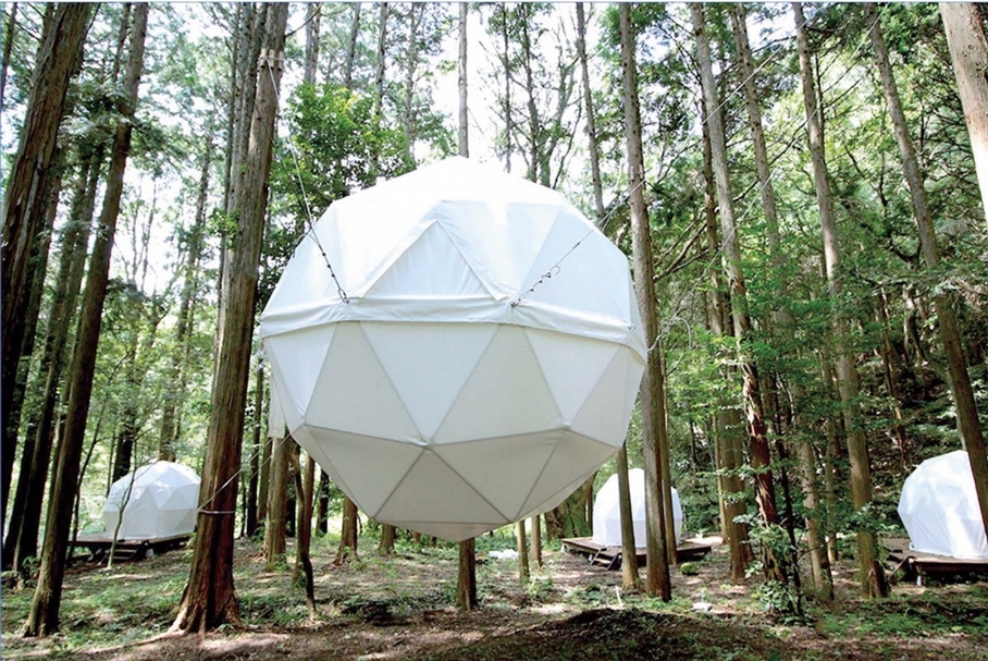日本靜岡縣的代代木公園擁有非常多的樹,就像森林一樣。在樹和樹之間,懸掛著一顆顆白色巨大的球形帳篷,可以讓人在裡面休息。仔細看,球面是用很多▲組合而成的喔。