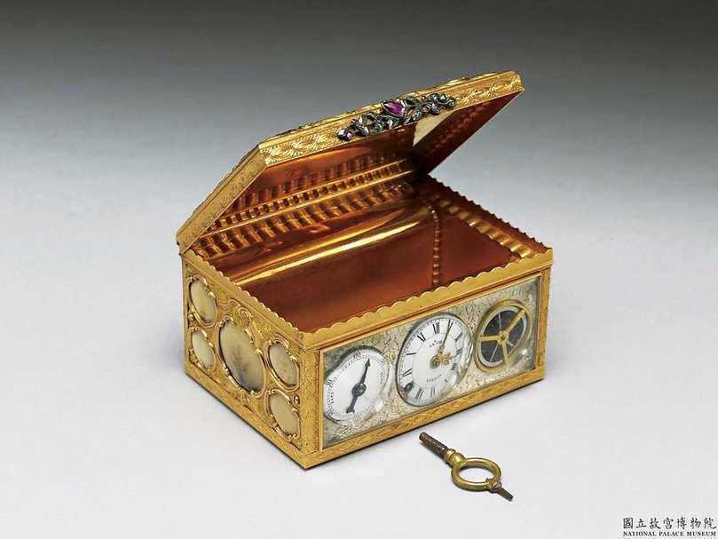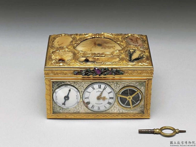 乾隆皇也是時尚達人!身邊總是有著充滿設計感的東西,像「鐘錶盒」是當時貴族們很流行隨身帶著的物品,小小的,可以放在手上玩,這可是英國送給乾隆皇的禮物,盒子外面有小小的時鐘,刻著美麗的花紋,還有稀少的植物化石和一支迷你的鑰匙!猜猜看,裡面會放什麼呢?