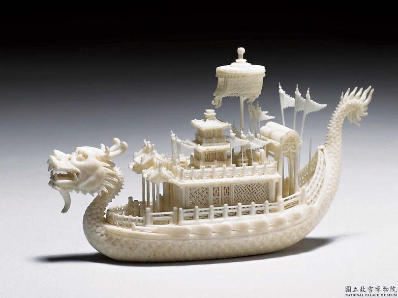 在皇帝收藏的寶物裡,常常會看見雞的圖案。原來雞在古代被認為是一種很厲害的動物,具有優良的品格。這個公雞盒身體胖胖的,裡面放著一個非常迷你的小龍舟,是用象牙雕刻的,船上有一座宮殿,連窗戶上面的裝飾都看得見喔!還有皇帝出門時,用來遮陽光的傘,飄揚的樣子,就像風正在吹呢!
