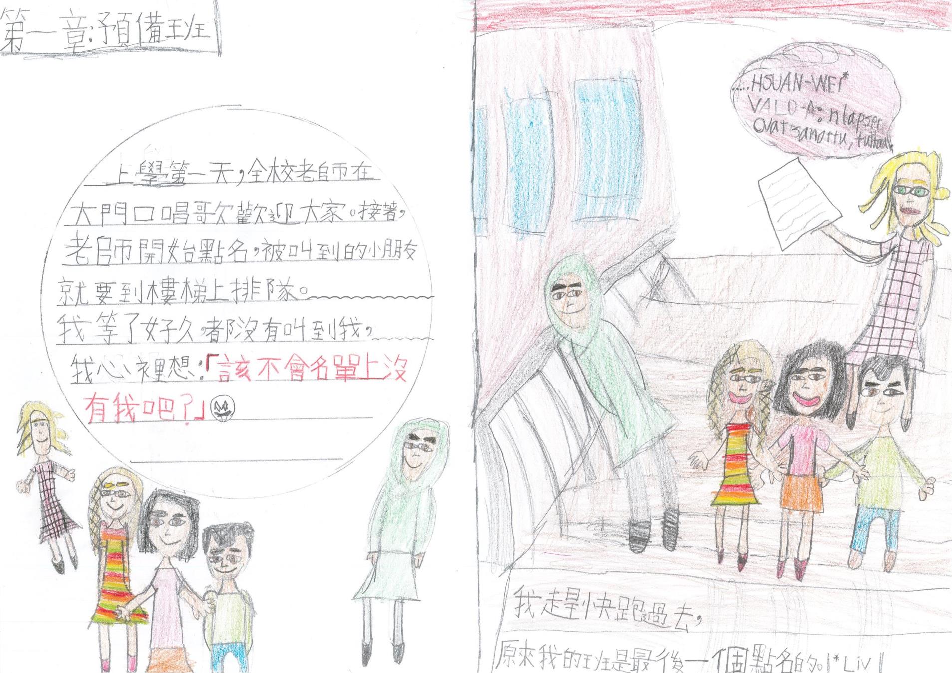 上學第ㄧ天,全校老師在大門口唱歌歡迎大家。接著,老師開始點名,被叫到的小朋友就要到樓梯上排隊。我等了好久,都沒有叫到我,我心裡想:「該不會名單上沒有我吧?」