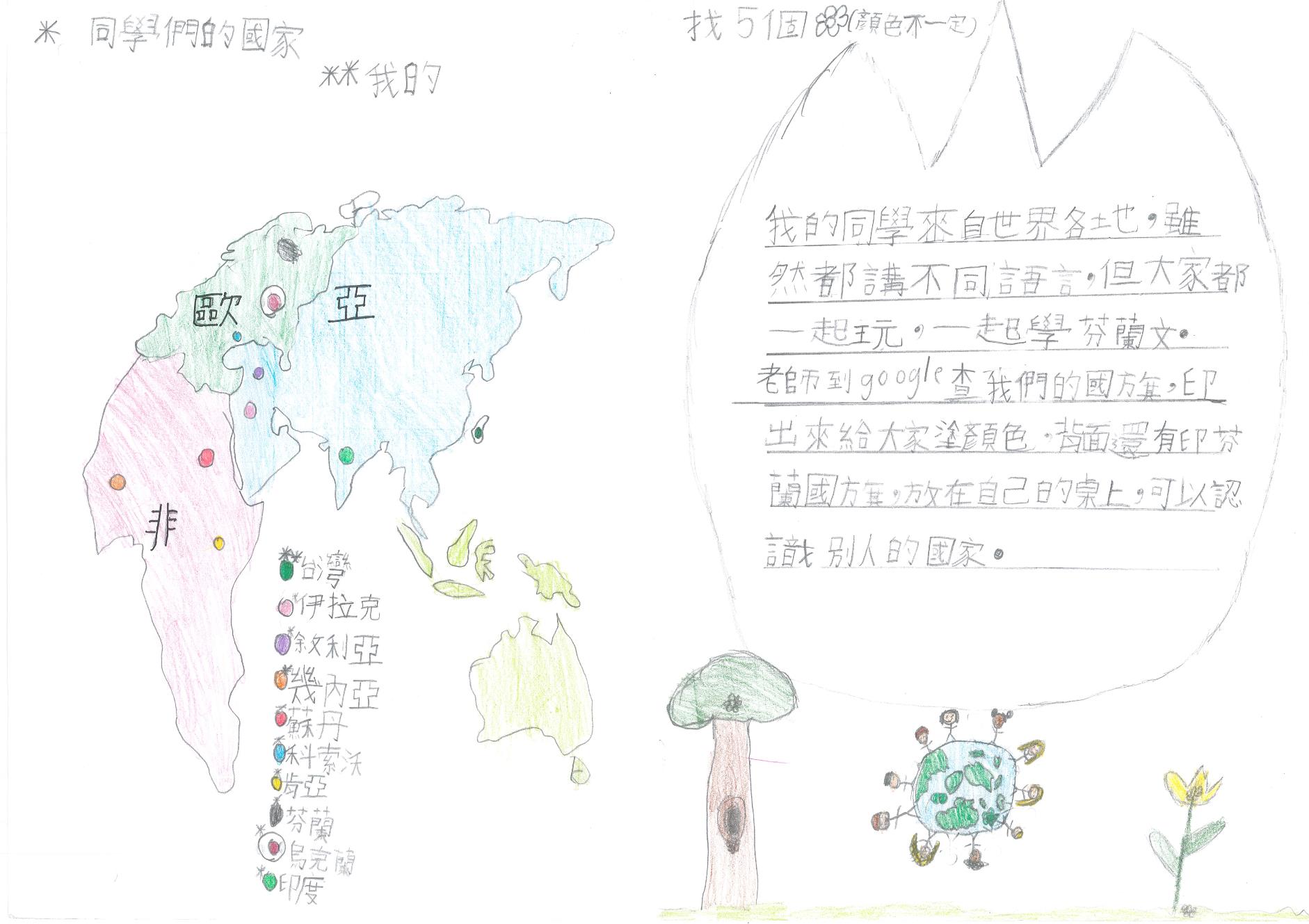 老師到google查我們的國旗,印出來給大家塗顏色,背面還有印芬蘭國旗,放在自己的桌上,可以認識別人的國家。