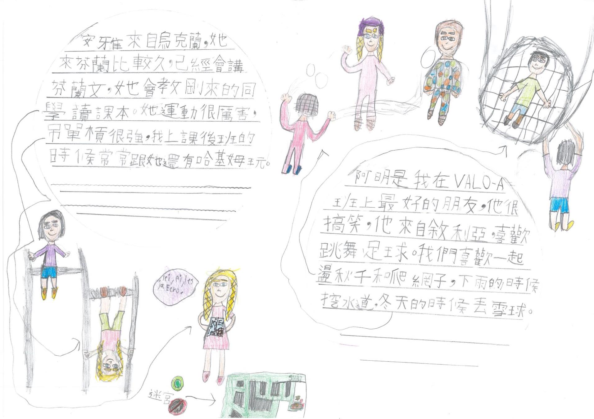 安雅來自烏克蘭,她來芬蘭比較久,已經會講芬蘭文,她會教剛來的同學讀課本。她運動很厲害,吊單槓很強,我上課後班的時候常常跟她還有哈基姆玩。