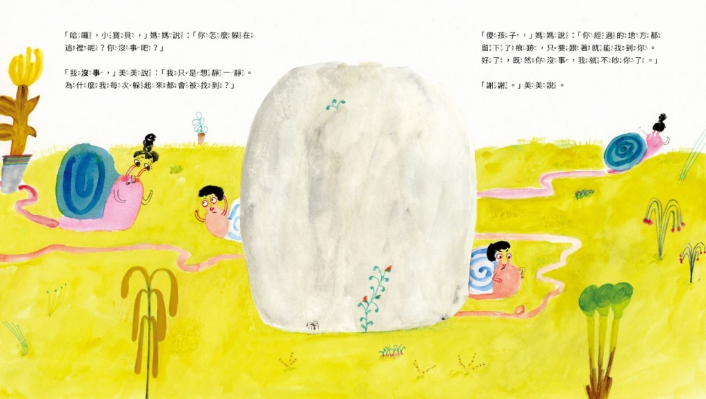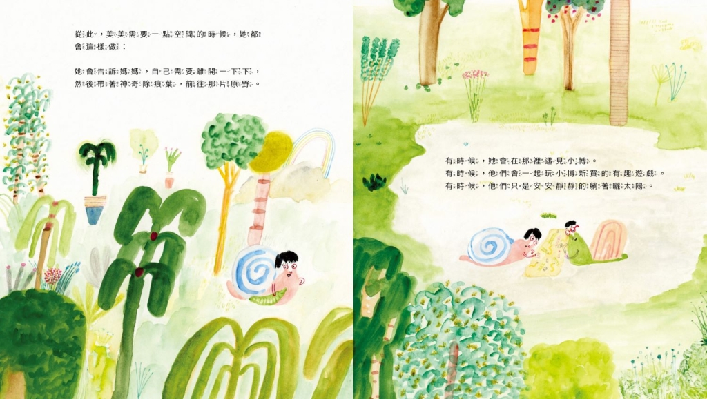 《蝸牛美美想獨處》則是相反的例子。在某次看到克里斯多・庫爾塔格魯的作品後,我就一直想與他合作。早在前一年我就完成這個故事,然後寄給他併詢問是否有合作意願,當我看到他為蝸牛畫上頭髮時,我就知道他絕對是理想人選!和無數插畫家共事是我工作中最棒的一部分。我是偏向文字型的人,而我喜歡和擅長圖像記憶的人合作。