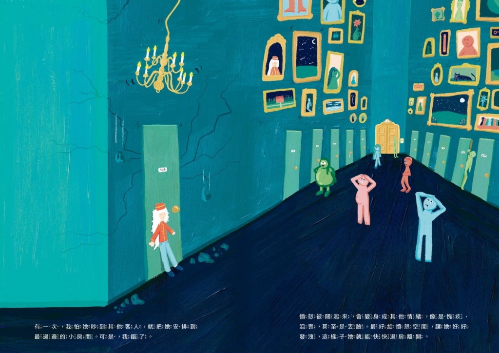 我喜歡「情緒大飯店」裡,不急著告訴、教育讀者怎麼處理、表達情緒,也不侷限於「怪獸」或「動物」特定比喻,圖像的流動感打開了讀者的想像可能,也隱喻了每個人與每個感受的獨特性。