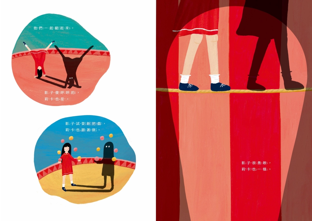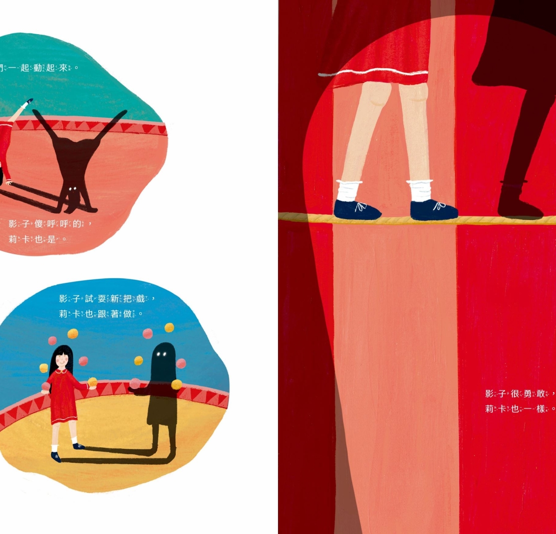 而在《影子馬戲團》裡,當莉卡願意正視影子時,影子帶給莉卡勇氣,莉卡跟影子一起的玩耍,莉卡更看見了影子的樣子,是傻呼呼的、是勇於嘗試的,那些莉卡原本不敢直視的,都在「玩」中,打開了空間,互相陪伴,一起冒險。