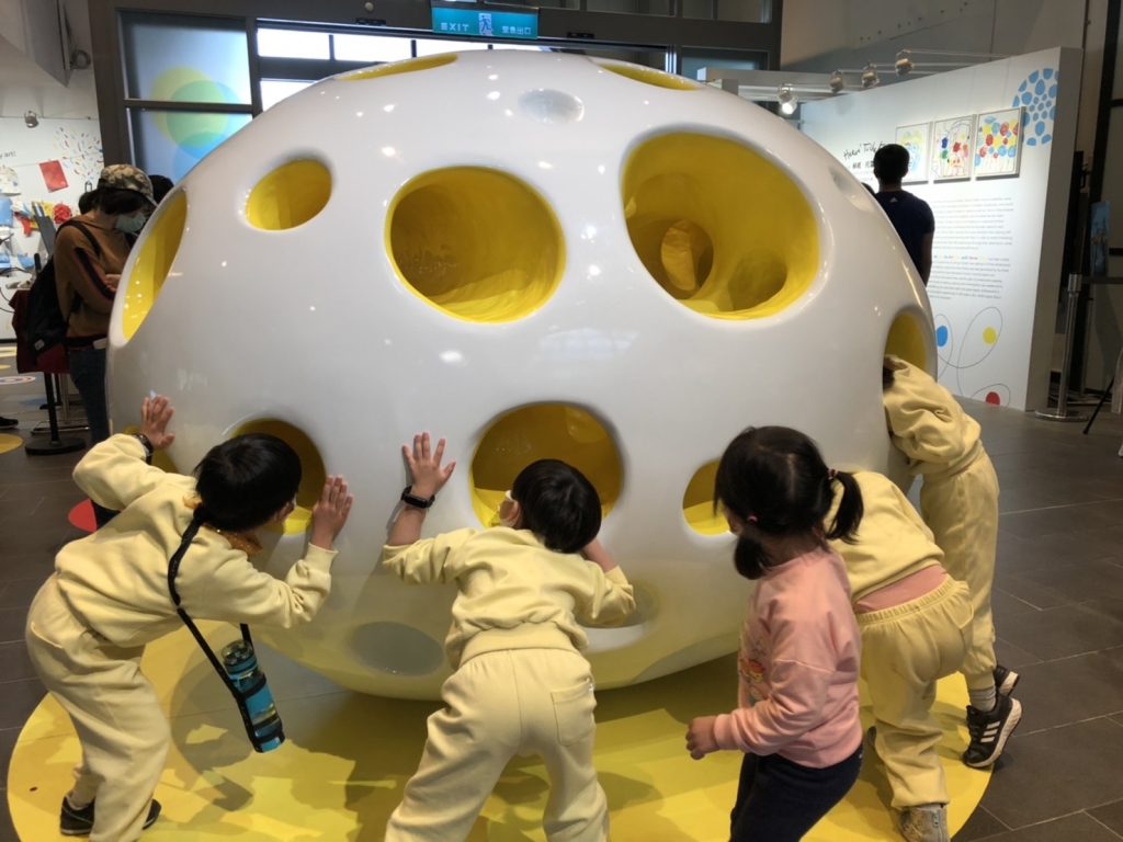 這是一個亮白卻遍布穿透性孔洞的蛋形球體,從大大小小的孔洞透出來的內部光滑鮮黃質感,誘人親近。孔洞提供不同觀察的視角,也促成觀眾與空間的連結。