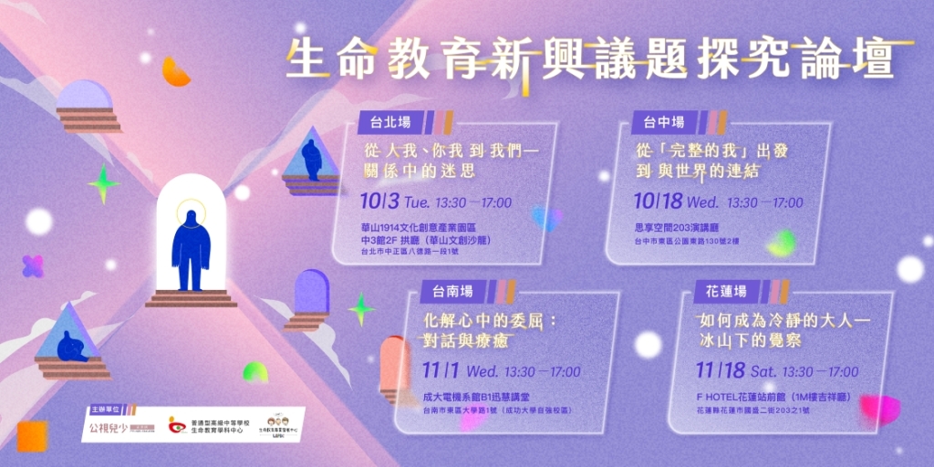 為了讓教師與大眾都能對心理健康、虛擬世界與生命意義等主題進行深入討論,公視兒少教育資源網、普通型高級中等學校生命教育學科中心、生命教育專業發展中心共同舉辦北中南東四場《生命教育新興議題探究論壇》,邀請哲學、教育、社工、宗教、兒少精神科等不同領域專家探討青少年憂鬱、人際關係、生命教育等議題。