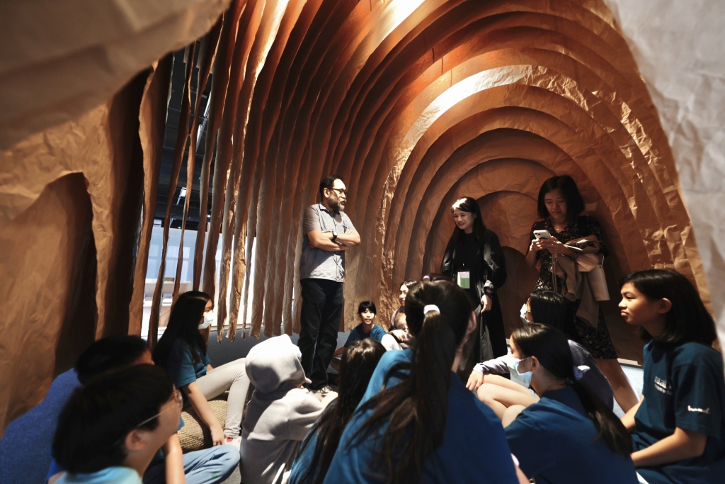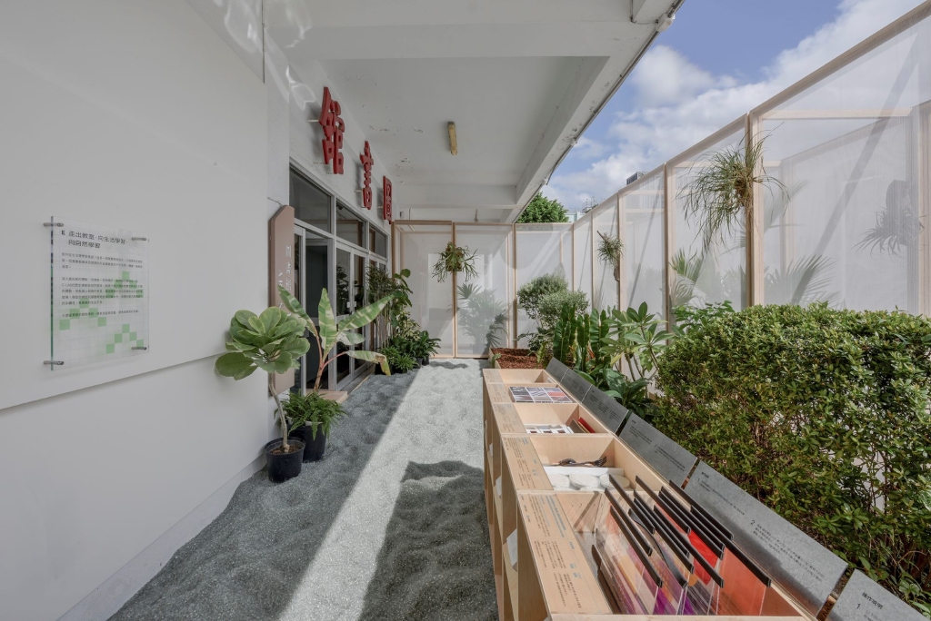 美感進行式即意謂著以「美感」帶領,連結美與智、涵蓋生活與生態的當代信念,為未來「創造改變」。永續的觀點也細膩地呈現在展場與活動設計:來自土地的感動展區中,以回收課本包裝材變身為「我的大耳朵」發呆聆聽亭,美感串連式展區則以可回收線材織造「我是地球人」親子互動牆,戶外展區更用回收玻璃作為鋪面設計,透過陽光,感受自然與美感交織出的魅力。展場原來就是圖書館也啟發成為巧思,展覽的展架將來將提供成為教室內的書架。