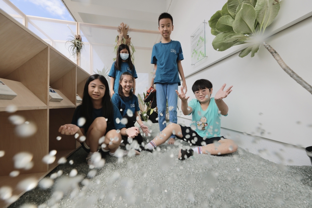 「走出教室,向生活學習、向自然學習」展區使用回收玻璃作為鋪面設計,讓民眾可透過陽光,感受自然與美感交織出的魅力。藉由生活中常見回收物品再利用,結合美感創意元素,讓參與民眾能真切接觸與感受生活中的美感與美好,更進一步透過美感連結生態永續循環發展,啟發其對周遭環境與社會議題之關心。