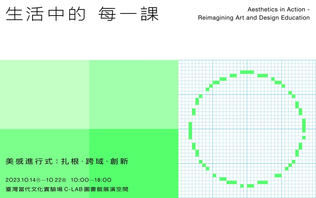 教育部美感教育中長程計畫第二期五年計畫(108-112)課程與教學成果特展「生活中的每一課」,集合影像、教案、講座與工作坊等,將於112年10月14日起至22日在臺灣當代文化實驗場C-LAB圖書館展演空間展出。匯聚「幼兒園美感教育扎根計畫」、「跨領域美感教育卓越領航計畫」及「美感與設計課程創新計畫」等3個課程與教學計畫成果,透過靜態展品呈現、互動式工作坊與講座等多元形式,邀請各界共襄盛舉。